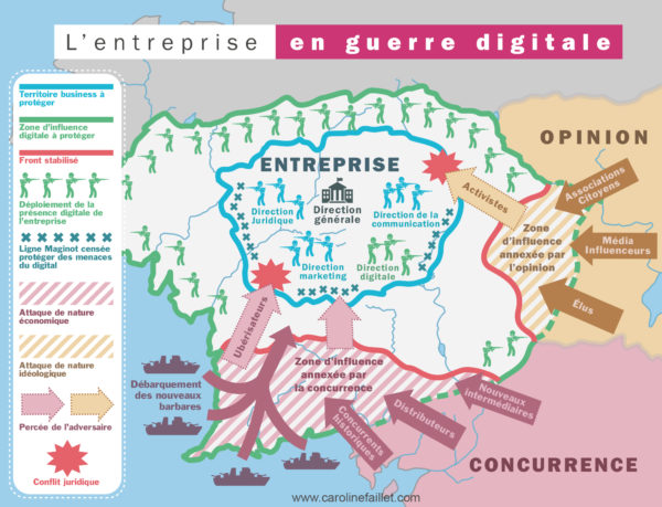 14h30, la conférence de Caroline Faillet débute lors d’un événement organisé par Digimind. Les mots sont vifs, la pensée est claire et l’audience captivée. Je viens de prendre la direction du pôle digital d’une agence de communication alors que Caroline projète sur l’écran une carte intitulée « L’entreprise en guerre digitale ». Mes cours de géo sont bien loin mais ces drôles de légendes me séduisent; quelques années plus tard, j’ai le plaisir de franchir la « ligne Maginot » en sa compagnie. Portrait d’une femme pour qui les zones d’influence sont des territoires à conquérir.